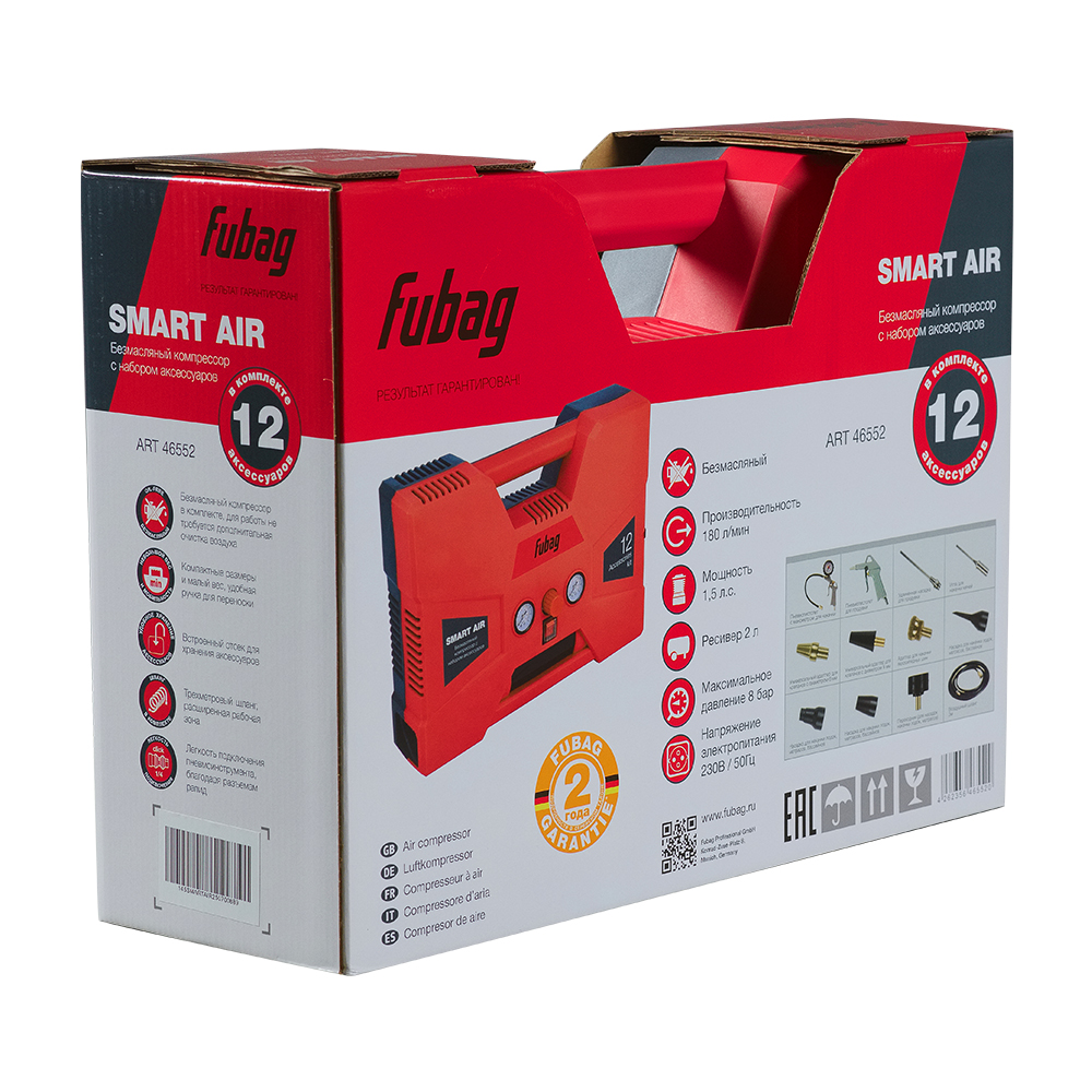 Многофункциональный набор FUBAG Smart Air — готовое решение для работы со сжатым воздухом. Набор собран на базе коаксиального безмасляного компрессора с ресивером на 2 литра. Комплект предназначен для накачки колес, мячей, матрасов, продувки и чистки поверхностей. Всё оборудование компактно размещено в корпусе, выполненном в виде удобного чемодана для транспортировки и хранения.